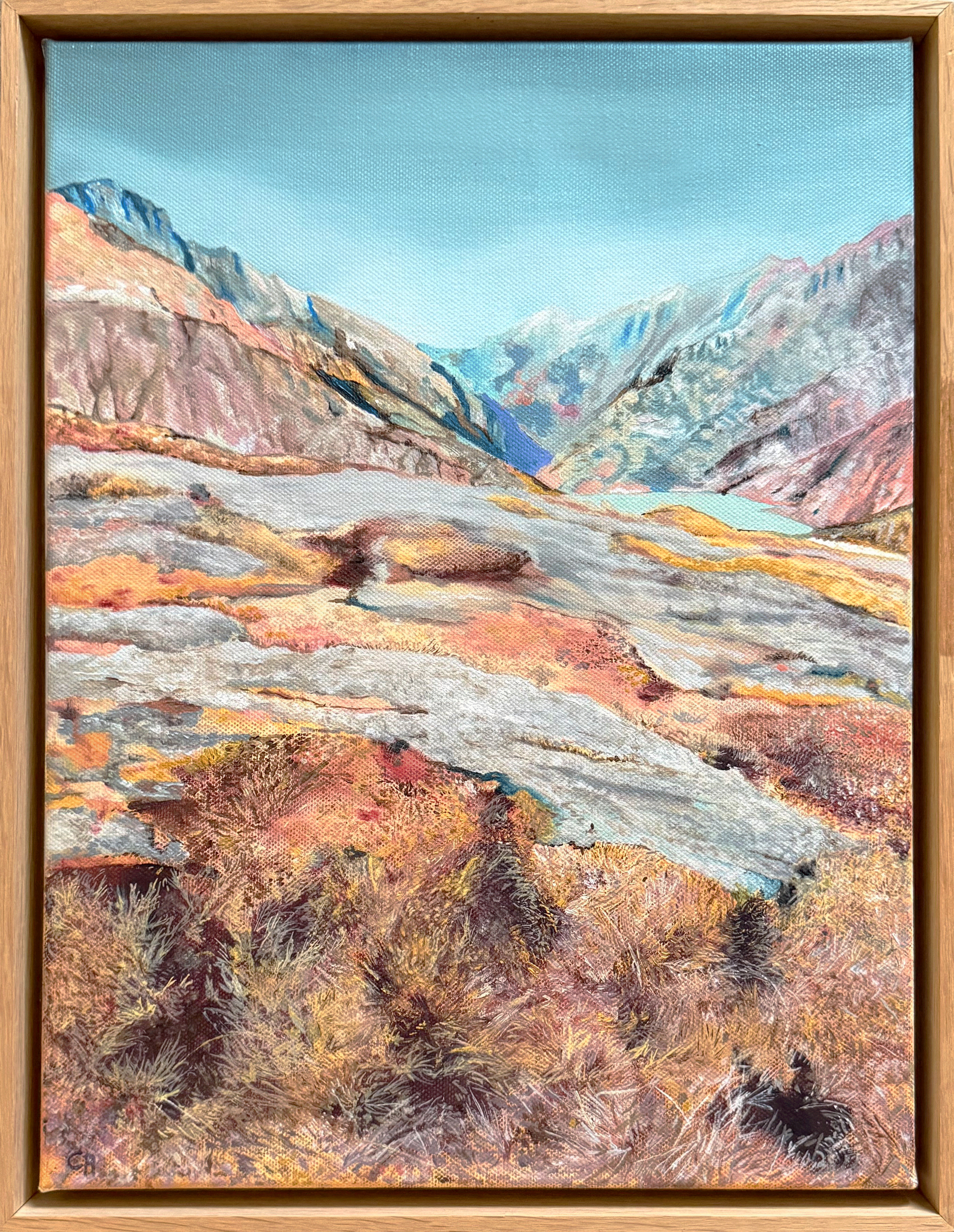 The composition draws the viewer’s eye along a winding valley flanked by rocky slopes, leading toward a serene turquoise lake and distant peaks under a pale blue sky. The textured foreground and luminous palette evoke the raw, elemental character of this iconic Swiss landscape.